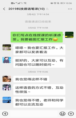 本学期我承担《科技德语口译》课程。从本课程的特点出发,需要学生的口译实践。因此,本人在每次备课时均准备了前期学生要研读的资料发布于雨课堂,但为了课程的效果,需要学生的现场口译实践和问答环节,还将微信群作为上课的直播平台。雨课堂和微信直播两者结合,达到了预期的效果。本次课共分三部分内容:教师讲解+学生口译实践+学生报告。师生都这样的在线授课方式均表示很满意。