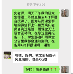 因为雨课堂教学平台无法实现师生间的语音互动,而这门课程最重要的就是增强学生的第二外语能力,特别是学生较弱的听说能力,所以教师特别提前向研究生院申请和报备,采用QQ平台进行授课,并得到了研究生院的批准。