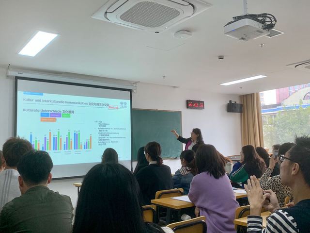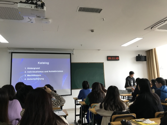 11月2日上午,德语系在国合楼412教室举办了课程思政公开课暨研讨会。本次公开课主讲人为王婀娜副教授,所授课程为面向2018级德语专业的跨文化交际(德),德语系全体教师旁听了此次公开课并于课后进行了交流和研讨。