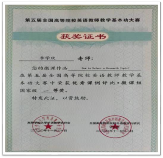 由高等学校大学外语教学研究会和全国高等师范院校外语教学与研究协作组共同主办的第五届全国高等院校英语教师教学基本功大赛评选工作圆满落幕。pp电子公共英语教研中心教师李学欣的微课作品“How to Select a Research Topic?”从竞争激烈的众多参赛作品中脱颖而出,最终斩获2020年度优秀课例评比·微课组“国家级一等奖”。