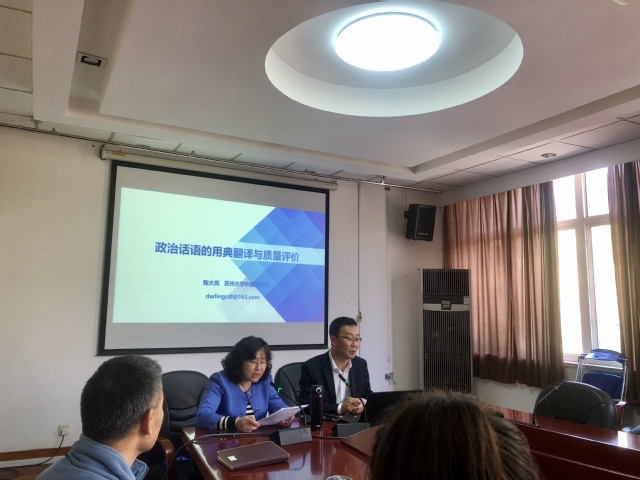 4月19日下午1:30至3:00,pp电子官方网站入口举办学术讲座,苏州大学特聘教授、博士生导师、翻译学科带头人陈大亮教授以“政治话语的用典翻译与质量评价”为主题,与翻译硕士研究生和导师分享学术研究成果。讲座由pp电子官方网站入口副院长韩戈玲教授主持。