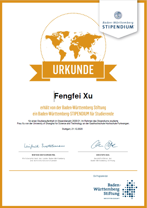 202010月,pp电子与德国富特旺根应用技术大学开展冬季学期海外交流,选拔出数名学生赴德进行交流学习。其中,pp电子2017级研究生徐凤霏在德学习期间荣获巴登-符腾堡州奖学金。