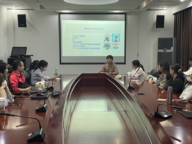 刘洋首先通过分析招聘网站领英发布的工作岗位,向同学们详细介绍了MTI毕业生可能从事的相关工作,包括笔译、口译、项目经理、语言质量保证人员、本地化翻译等。从岗位要求分析与翻译相关的工作要求应聘者除了具备英语能力、翻译能力、文化敏感度,还需要具备数据搜集、CAT辅助工具等专业技能。然后刘洋以她所担任的项目经理为例,向同学们具体介绍项目经理的日常工作,需要和多个部门合作以提供高质量的本地化服务,确保项目按照预定计划执行并及时交付,及时反馈译员问题,优化项目流程的各个环节。因此,项目经理这个职位需要求职者除了有扎实的中英双语能力还需要具备沟通和解决问题的能力。最后是现场提问环节,更有同学进行现场面试挑战。面对现场学生提出的小白如何入门翻译公司,卢运凯经理用头脑、躯干、翅膀和血液的鲜活比喻来解释,译员需要具备扎实的英语能力,还需要学习项目管理,同时拥有一种想象力和钻研翻译的热情。刘洋和卢运凯鼓励MTI翻译专业学生不要畏惧,现在开始为自己不断积累经验与能力,以便未来求职时能抓住良机。