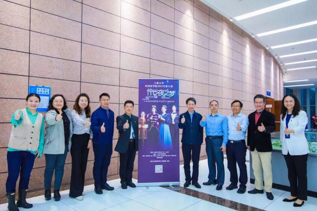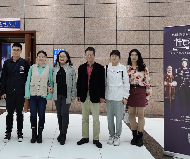 2021年5月26日晚,pp电子党委副书记金小东一行师生8人应上海大学pp电子官方网站入口的邀请,来到上海大学伟长楼,进行了以莎剧为主题的友好交流活动。随行的有pp电子莎剧总指导王影君副教授、莎剧指导教师程雪芳博士,以及第二届莎剧《皆大欢喜》的5位同学,导演闻庭婧、学生负责人牟凌萱、主演环筱语、马言飞和杨煦涵。金小东一行与上海大学外国语学院领导和来自于西安外国语大学、上海戏剧学院等院校的嘉宾一起参加了上海大学第九届莎士比亚戏剧节开幕式,并观看了毕业季大戏、莎剧《仲夏夜之梦》的现场演出。