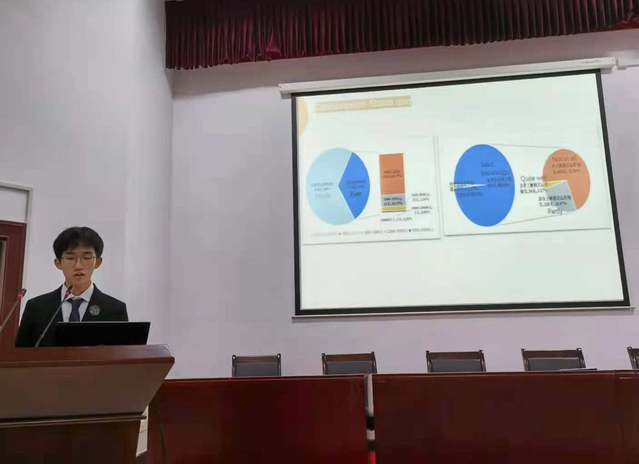 随后,论坛正式开始。所有学生按照所在的班级和研究选题,分为21个研究小组,选派代表依次上台演讲,向在座的老师和同学介绍各自小组的研究话题、研究背景、研究目标、研究结果和启示意义。演讲者着装整洁,落落大方,自信满满,在规定时间内圆满地完成了小组课题的英语汇报。经过激烈角逐,周洪阳小组斩获特等奖,沈雨桐小组、朱晗小组荣获一等奖,马千逸小组等4组荣获二等奖,刘霏霏小组等6组荣获三等奖。同时,日语专业的刘霏霏、杨文韬和德语专业的马千逸、周洪阳凭借出色的演讲能力荣获个人风采奖。出席论坛的领导和嘉宾为获奖选手颁发了荣誉证书。