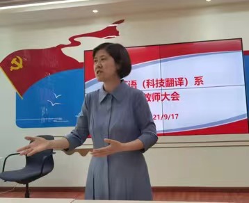 新学期,新气象,英语(科技翻译)系于近日在外语楼党建活动室召开了本学期第一次全系教师大会。会上姜诚主任回顾了暑期实践课得以顺利开展并取得非常满意的教学效果,希望今后我们系能够在实践教学方面进一步深入探究,把实践教学课程与理论课程有效结合,提高学生创新实践能力。暑期很多老师积极参加了各种各类的教学教研活动,收获颇丰,为这一新学期的到来充满新能量。此后,贾晓庆和邬菊艳两位副主任也分别介绍了教学和教研等方面的具体工作。