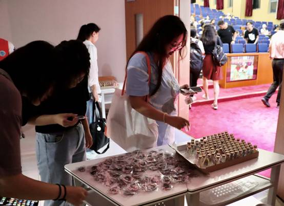 在开学典礼开始前,外院学生会的学长学姐们在入口处发放为大家精心准备的外院专属纪念品——印有外院吉祥物“小外”的钥匙扣和许愿瓶。