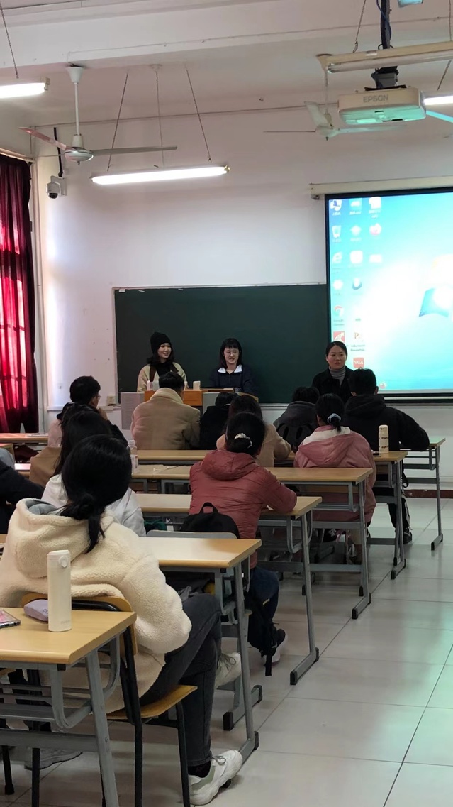 在孟小果老师简要介绍之后,首先由邓颖娟学姐介绍了德语学习、课外比赛、课外活动和实习方面的经验。在德语日常交流方面邓颖娟推荐了hello talk、每日德语听力等app,鼓励学弟学妹们应积极参加老师们推荐和官方机构组织的各类比赛,同时多参加德国文化交流中心组织的各类活动。接着保研到上海外国语大学的赵小楠学姐详细分享了自己的保研经历,告诉在座的大一新生们从一开始就要夯实好德语基础,平时积极参加各类学科竞赛。此外她还强调了外语系学生早读的必要性,肯定了早上大声朗读对学好德语的重要性。
