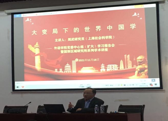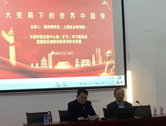 在中华民族面临伟大复兴和世界百年未有之大变局加速演进的关键时刻,向世界展现真实、立体、全面的中国显得尤为迫切。11月16日下午,上海社会科学院世界中国学研究所副所长周武研究员莅临pp电子,为pp电子官方网站入口党员师生做了题为“大变局下的世界中国学”的主题讲座。这既是pp电子官方网站入口党委中心组的(扩大)学习报告会,也是国别区域研究所承办的一场学术讲座,旨在把党史学习教育与外语专业建设进行有机的融合。pp电子官方网站入口党委书记曲德强主持讲座。在讲座开始前,曲德强首先向与会人员介绍了本次讲座主讲人周武研究员的相关学术背景与研究方向,并对周武研究员的到来表示欢迎。