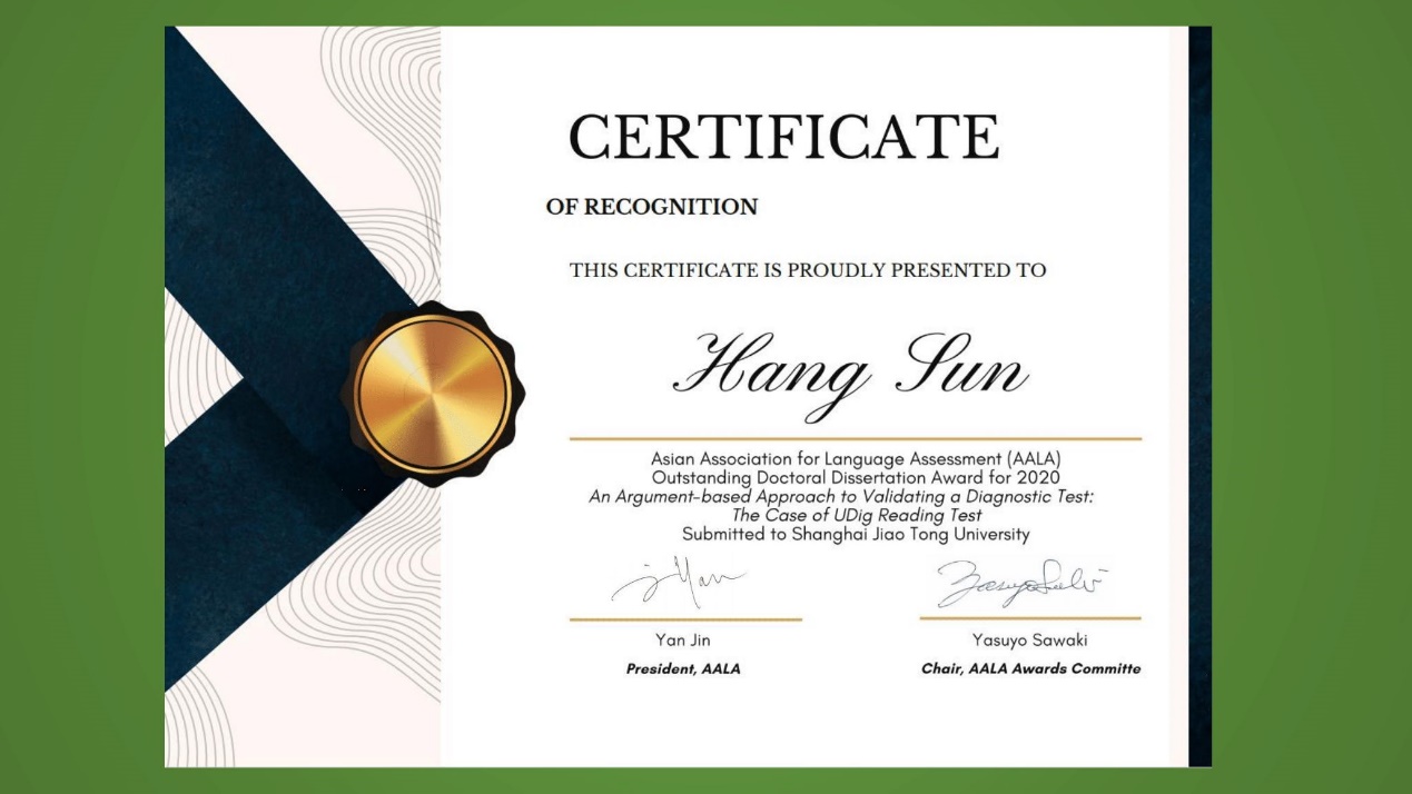 近日,亚洲语言测试协会(Asian Association for Language Assessment)公布了优秀博士论文奖(The AALA Outstanding Dissertation Awards)评选结果,pp电子公共英语教研中心、语言学研究所孙杭博士荣获2020年度亚洲语言测试协会优秀博士论文奖。