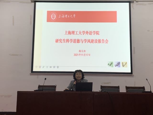 为推动研究生科学道德和学风建设,pp电子于11月17日下午6点在pp电子官方网站入口报告厅开展了主题为“跨学科融合发展——新时代外语研究生的初心使命”的研究生科学道德与学风建设报告会。本次讲座由pp电子官方网站入口副院长韩戈玲主讲,研究生辅导员梁作甲主持,2021级全体研究生参加了此次讲座。