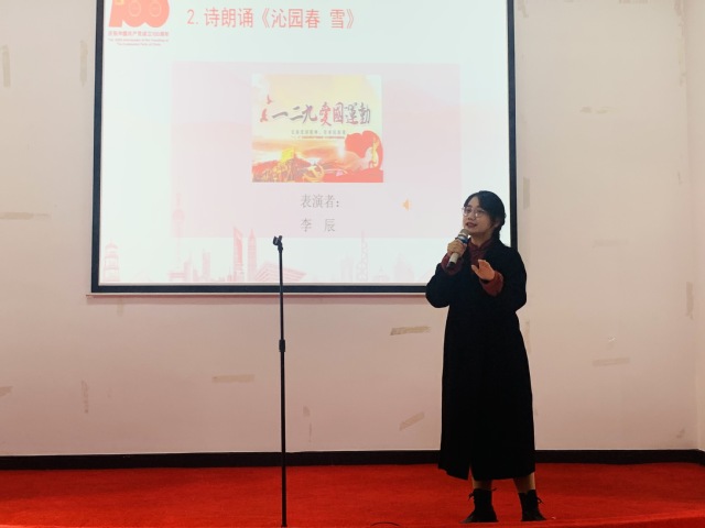 此次党日活动共有七支队伍给大家带来了精彩的节目。节目主要有三种形式,分别是诗朗诵、配音、红歌合唱。马文、冯娟娟等人带来的诗朗诵《七月的天空》。这首诗“用如火的激情高唱世纪里一首不朽的赞歌,用深情的笔墨书写一段艰辛的历程”。李辰带来的诗朗诵《沁园春 雪》,她的声音里有着“欲与天公试比高”的豪情,饱含深情的朗诵激励我们奋发向上,“数风流人数,还看今朝。”陈猛、辛丽君等人带来的诗朗诵《光的赞歌》,从娓娓道来到慷慨激昂,道出了当时人们心中最迫切的渴望:“光明是属于人民的,未来是属于人民的。”最后一个节目是由王琪琪、何明珠、吴奕玫带来的诗朗诵《永远跟党走》。深情的朗诵中饱含着浓浓爱国情,更加坚定了我们永远跟党走的决心。