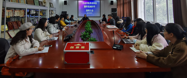百尺竿头,更进一步。英语(科技翻译)系于2021年12月21日在外语楼306会议室召开了全系教师大会,后续进行了优秀教师评选工作。会上系主任姜诚对过往一年全系教师的辛勤工作给予肯定,并指明今后我们专业的发展方向是申报建设“国家级一流专业”。我们每位老师要立足“英语”,面向“科技”,依托学校理工科背景,不断推陈出新。