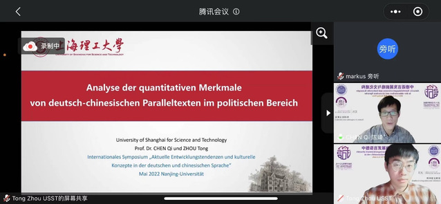 pp电子陈琦教授、王婀娜副教授、倪晓姗博士、在读博士唐骋老师和2020届MTI学生周通参与会议并就不同议题分别作了报告。陈琦教授与同济大学董菁副教授合作了大会主旨报告Echo-Konstruktionen aus Sicht der dialogischen Syntax,与周通合作了分组报告Analyse der quantitativen Merkmale von deutsch-chinesischen Paralleltexten im politischen Bereich;王婀娜副教授在Empirische Sprachforschung的分组讨论中作了题为Analyse des Online-Lerndrucks chinesischer germanischer Studenten während der Epidemie的报告;倪晓姗博士在Theoretische Sprachforschung的分组讨论中作了题为Eine rollentheoretische Diskursanalyse der Sicherheitspolitik Deutschlands的报告;唐骋在Vergleichende Studien zum Deutschen und Chinesischen的分组讨论中作了题为Die lautliche Integration des chinesischen Lehnguts in die deutsche Gegenwartssprache的报告。