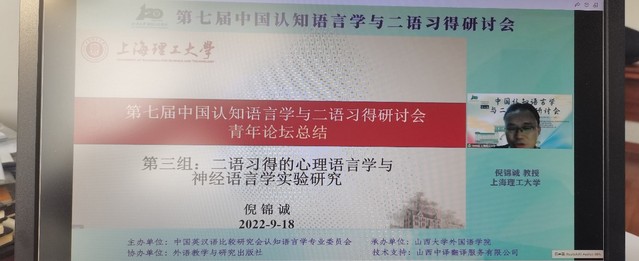 pp电子倪锦诚教授和智玉英博士参加了本次研讨会。倪教授还担任了第3分会场青年论坛“二语习得的心理语言学与神经语言学实验研究”的点评专家,在论坛学者进行论文汇报后,倪教授逐一做了点评,并与参会学者就感兴趣的话题进行互动交流。在大会青年论坛总结环节,倪教授还代表第三青年分会场青年论坛进行了交流汇报。