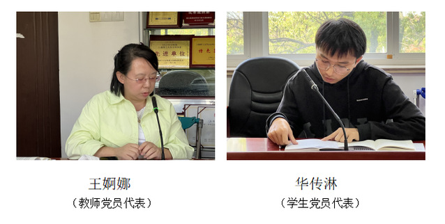研究生党员代表华传淋说,我们何其荣幸,生逢盛世,生于华夏,愿以吾辈之青春,捍卫盛世之中华,永远跟党走,奋斗新征程。作为一名pp电子官方网站入口的学生,我会努力发挥专业特长,传播好中国声音,展示好伟大中国发展成就。教师代表王婀娜说,在教学科研中,我们要充分利用各种资源,要讲好中国故事,同时要帮助学生树立四个自信,向外国人讲好中国治理理念。