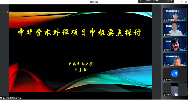 11月7日晚,中央民族大学外国语学院翻译系二级教授、翻译方向博士生导师、中国翻译协会专家会员何克勇教授应邀为pp电子教师作题为“中华学术外译项目申报要点探讨”的线上专题讲座。讲座由pp电子官方网站入口院长刘芹教授主持。pp电子诸多教师参加了本次讲座。