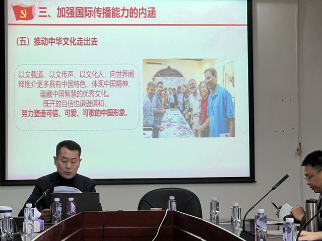 曲德强以“加强国际传播能力,提升国际传播效能”为题作了专题辅导报告。他结合pp电子官方网站入口的学科特色就加强国际传播能力的意义、内涵和举措开展了详细的解读,就全面学习贯彻落实党的二十大精神等进行了深刻的剖析,并介绍了pp电子官方网站入口党委开展学习党的二十大精神的有关情况。他指出,学院党委要求广大党员教师将党的二十大精神的学习和教学科研紧密结合起来,切实把所学所悟转化为工作动能和发展成效。他号召,学院教师要主动服务国家社会和学校发展,培育具有全球视野、通晓国际规则、熟练运用外语、精通中外交流和沟通的国际化人才,要从“翻译世界”转向“翻译中国”,不断加强我国国际传播能力,提升国际传播效能。