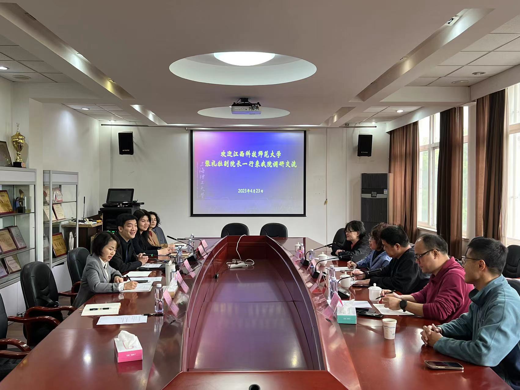 4月23日下午,江西科技师范大学外国语学院张礼牡副院长一行来pp电子调研交流。pp电子官方网站入口副院长、公共英语教研中心主任张乐,公共英语教研中心副主任陈征、黄凤秋、马芫和办公室相关人员参加了交流。会议由张乐主持。