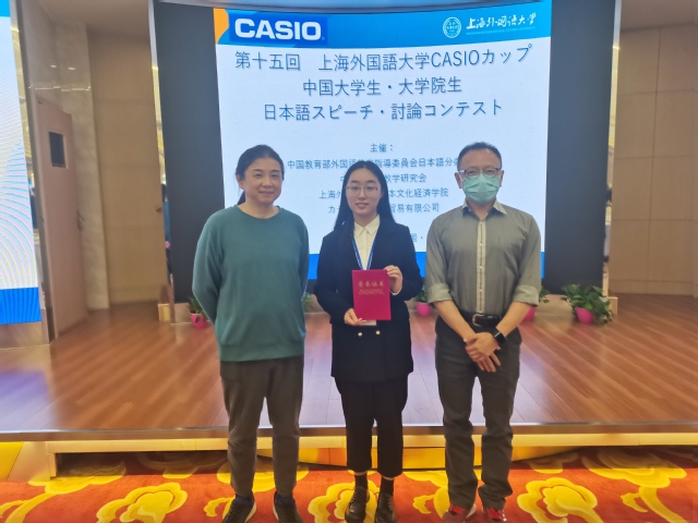 2023年5月20日,由上海外国语大学日本文化经济学院、教育部高校外语专业教学指导委员会日语分委员会、中国日语教学研究会、卡西欧(中国)贸易有限公司联合主办的第十五届上海外国语大学“卡西欧杯”中国日语专业本科生•研究生演讲辩论大赛决赛在上海外国语大学虹口校区成功举行。来自厦门大学、北京大学、上海外国语大学、南京大学、中山大学等国内知名23所高校的24名选手同台竞技、展现出各自出色的日语表达能力和思辨能力。pp电子本科2020级日语专业郭珂妤同学通过初赛选拔成功进入决赛,在决赛激烈的角逐中获得优胜奖。日语系江春华老师、福井祐介老师在比赛前期进行了精心的指导,获得“优秀指导教师奖”。