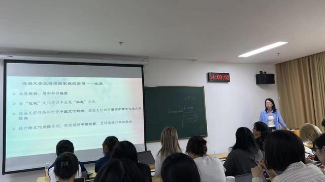 授课过程中,丛老师突出了中德文学交流的历史,以《诗经·秦风·无衣》《诗经·小雅·祈父》《寄李十二白二十韵》等的德译为例,讲解了中德文学交流的范式,学生在了解德国文学以及中德文学交流历史的同时,再次感受了中国文学之美,增强了文化自信,也更意识到自己作为外语学习者以及未来的跨文化传播者肩上承担的责任。