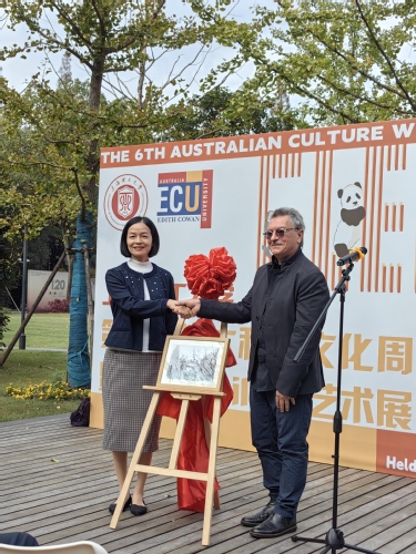 开幕式上由蔡永莲副校长和Clive教授为Glen Phillips的艺术展举行了揭幕仪式,庆祝两校合作25周年,其20幅水彩艺术品反映出中澳两国的风景和艺术交流的源远流长,并将在澳大利亚文化中心展出一周时间。