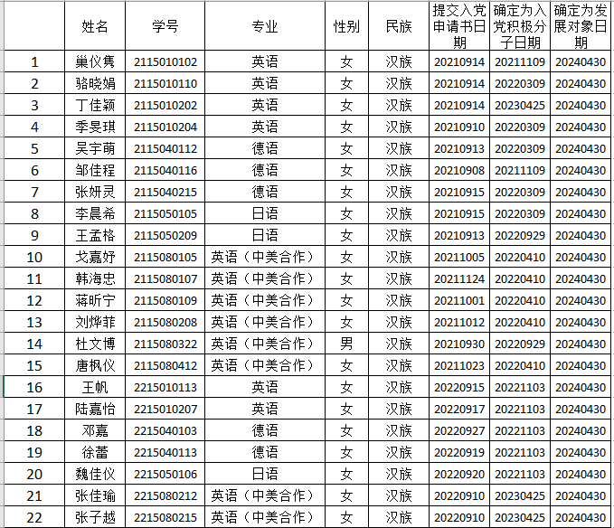 经各党支部培养考察并报pp电子官方网站入口备案通过,确定巢仪隽等22名同志列为党员发展对象(名单见附表)。为进一步增强发展党员工作的透明度,确保发展新党员的质量,根据《中国共产党章程》和《中国共产党发展党员工作细则》,现将发展对象的基本情况予以公示。