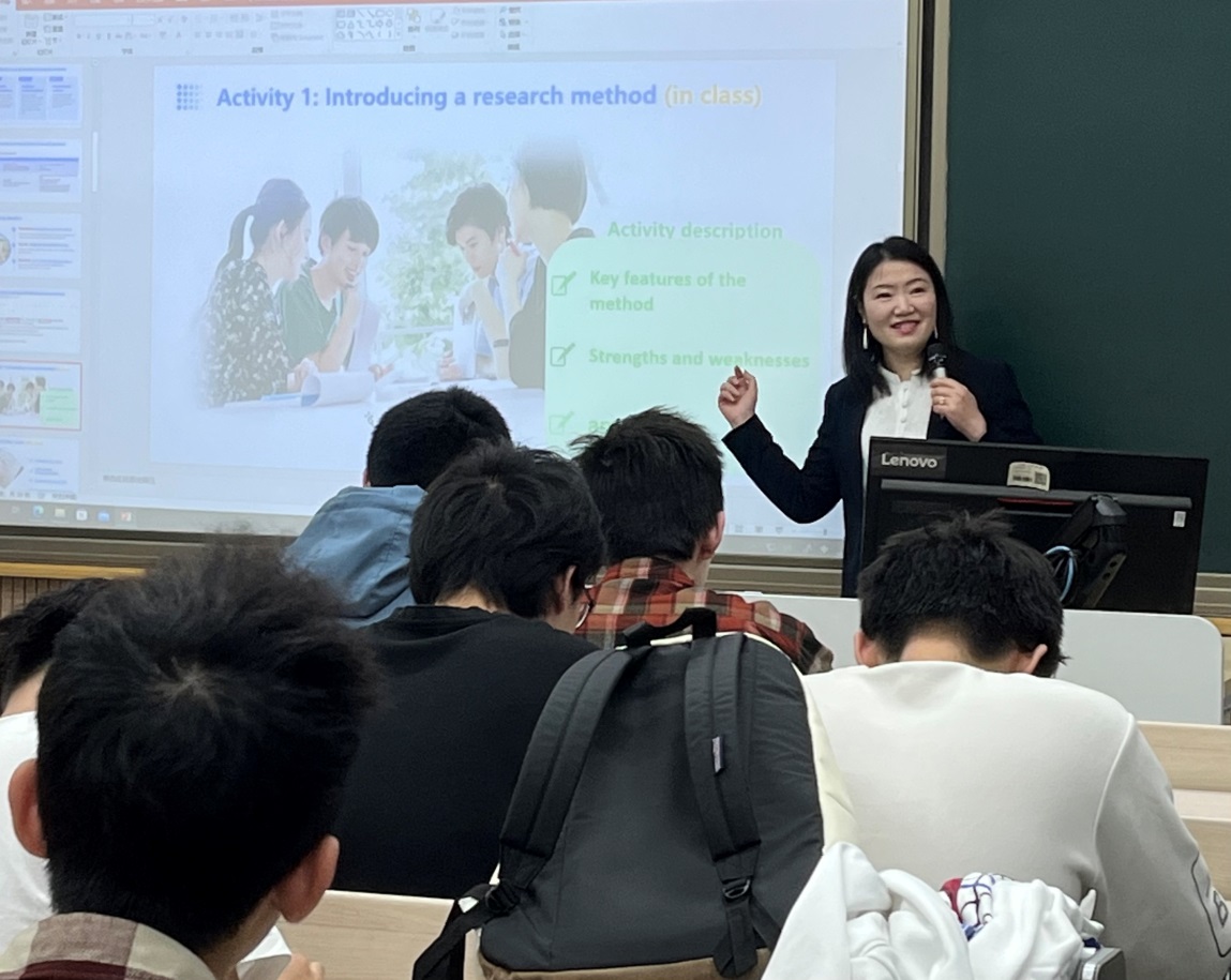 柏钧老师运用“任务型”和“产出导向型”的教学方法,将课程设计为“you know, you do,you write”三个环节,全面培养学生的知识、能力和素养。首先,学生们分组展示了课前布置的写作任务,即用英语评述与研究选题相关的研究方法。柏钧老师通过问答、指导和建议,引导学生们对“研究方法”有更广阔和深入的了解。接着,在第二个环节中,学生们分组讨论了多个学科的研究案例,并汇报了小组选题的研究方法和步骤。在教学的第三个环节,柏钧老师讲解了“研究方法”的写作结构和语言要求,并布置了同伴互评作业。学生们积极参与讨论并发言,展示了出色的英语表达能力和团队合作精神。最后,柏钧老师用“纸上得来终觉浅,绝知此事要躬行”的诗句鼓励同学们积极参与科研实践。