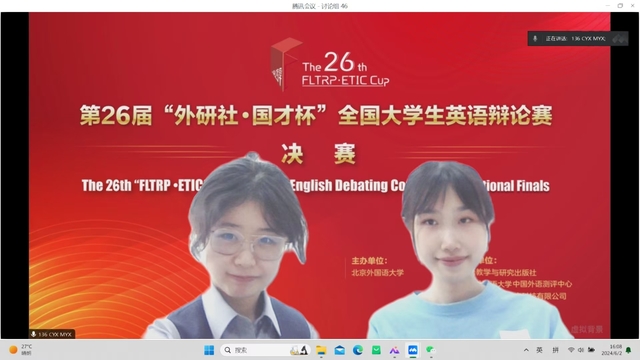 6月1日-2日,第26届“外研社·国才杯”全国大学生英语辩论赛全国决赛如期完成全部场次比赛。“外研社·国才杯”全国大学生英语辩论赛是国内最具传统、规模和学术权威性的大学生英语学科竞赛之一。参加本届比赛全国决赛的pp电子官方网站入口代表队由英语(科技翻译)专业程玉昕同学、英语(中美合作)专业麦钰暄同学等两位辩手及沈谢天、王晨等两位指导老师组成。