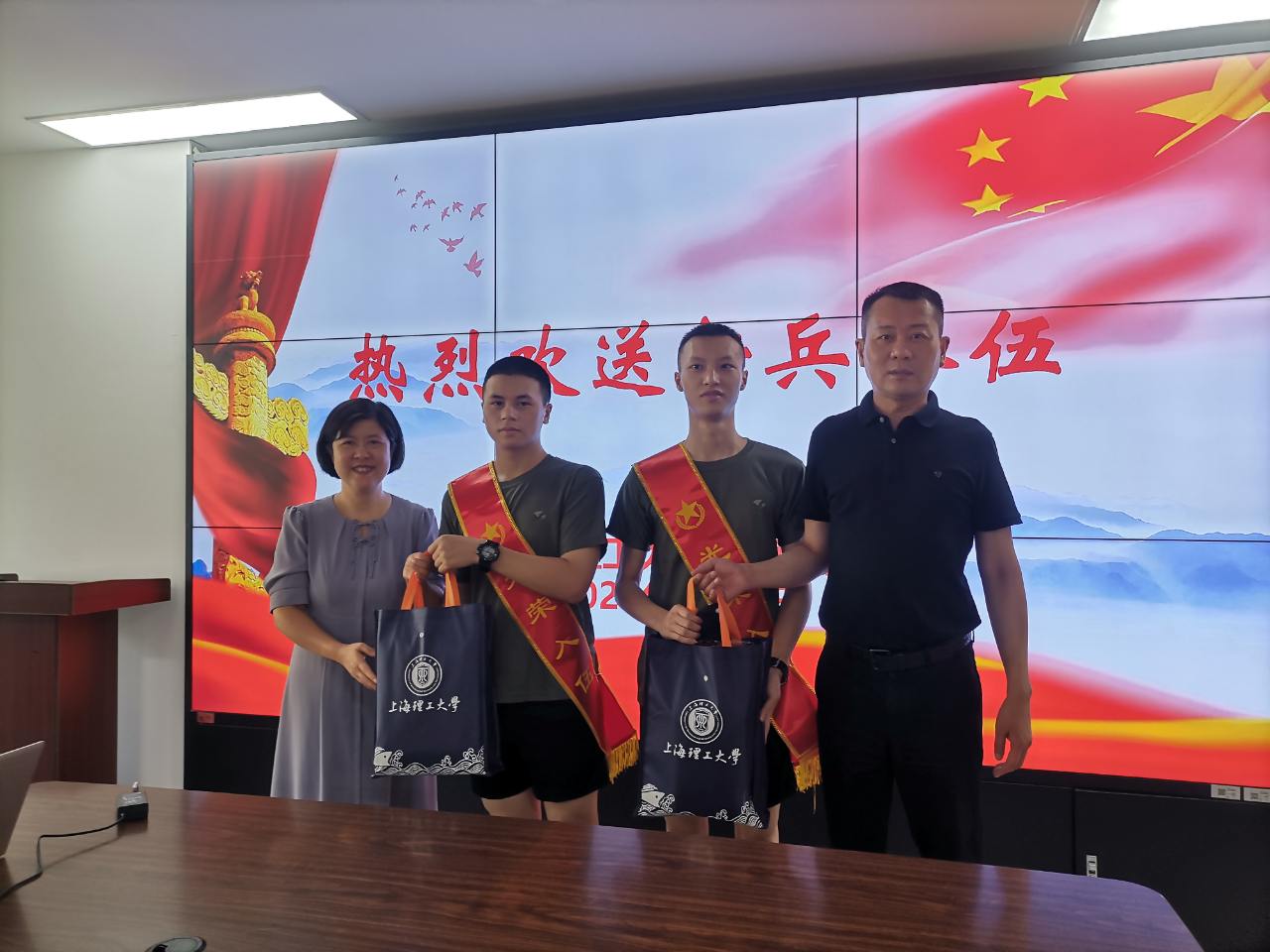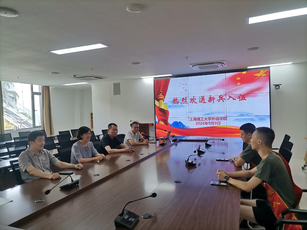 阳光雨露育青松,百年上理出英雄。9月9日是pp电子官方网站入口两位应征入伍的2024届毕业生庞贵升、蒋事博随大部队离校集训的日子,pp电子官方网站入口领导和辅导员齐聚一堂,举行了一个简短热烈的欢送会,欢送两名新兵入伍。参加本次欢送会的院领导和老师有pp电子官方网站入口党委曲德强书记、刘芹院长、金小东副书记,张乐副院长,以及学院分管专武工作的辅导员何伟琴。首先金小东副书记回顾总结了今年的征兵工作,接下来学院领导和两名新兵进行了亲切的交谈,对他们表示祝贺,嘱咐他们珍惜入伍机会,尽快适应部队生活,要不怕困难、刻苦锻炼,充分发挥外语特长,成为有理想、有担当、有本领的优秀军人。座谈会结束时,曲德强书记和刘芹院长为新兵送上慰问品,师生合影。祝愿他们在军营里书写青春、实现理想,展现新时代大学生风貌,为校添彩,为国争光。