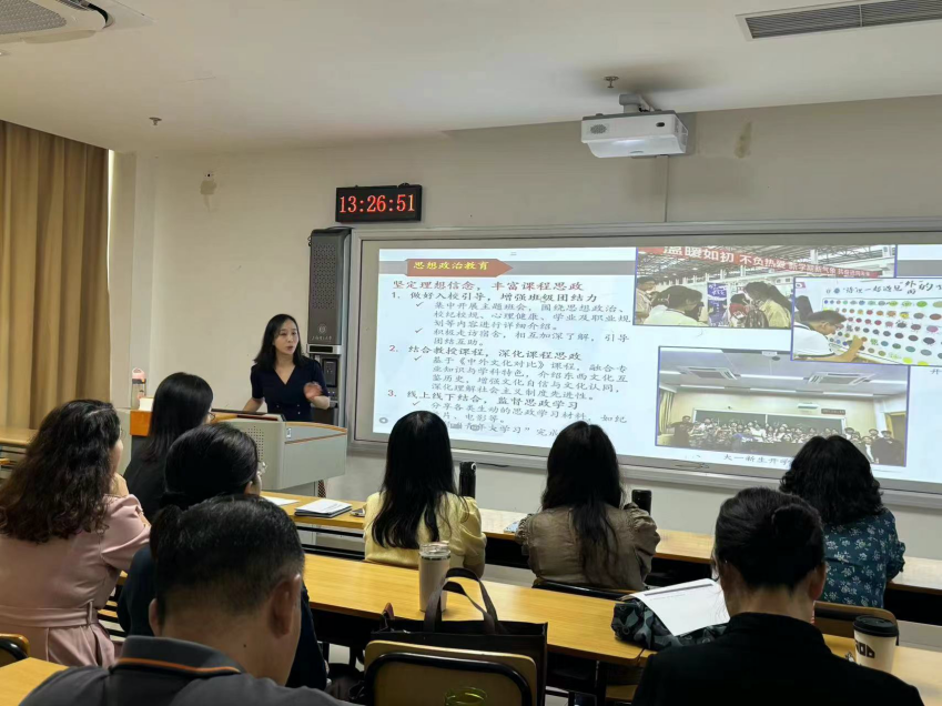 在课程思政教学研究交流环节,贾晓庆、智玉英和孔祥立三位老师相继分享了他们获奖的课程思政案例。贾老师通过深入挖掘教学内容中的思政元素,将其巧妙融入中高级口译课程教学中,同时她也强调了科技元素在科技口译课程的灵活运用。智老师分享了英语视听课程中的思政案例,阐述了她在课堂上如何环环相扣,鼓励学生发表观点、相互提问,激发学生对社会问题的关注与思考,在潜移默化中培养学生的思辨性思维和创新能力。最后,孔老师分享了他将毛泽东的学习经历以及教师自身对翻译实践一丝不苟的严谨求知精神放入案例中,让学生以前人为榜样,将思政教育贯穿于教学全过程中。