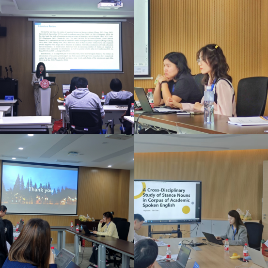 pp电子师生展示了自己在各自研究领域的探索和成果。秦丹作了题为“A cross-disciplinary study of stance nouns in corpus of academic spoken English”的报告;郑意茹作了题为“A comparative study of negation expressions in introduction sections of English and Chinese journal articles”的报告;杨茹意作了题为“A corpus-based diachronic study of the collocation of self-mentions in academic writing”的报告;吴嘉琪作了题为“Diachronic changes of ADJ in the patterns ‘it V-link ADJ that/to’ in English academic papers”的报告。
