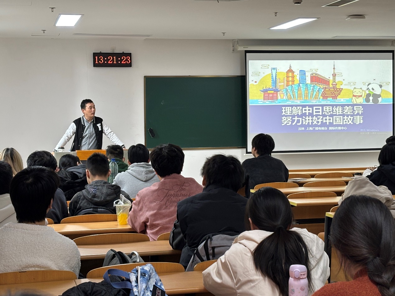 11月26日下午,上海广播电视台高级记者、全国唯一日语电视节目《中日新视界》负责人沈林老师应邀为pp电子官方网站入口日语系师生带来一场题为“理解中日思维差异,努力讲好中国故事”的精彩讲座。讲座由日语系主任杨本明教授主持,日语系外事负责人王俊红博士、董瑜老师及日语系本科生、研究生60余人参加了讲座。