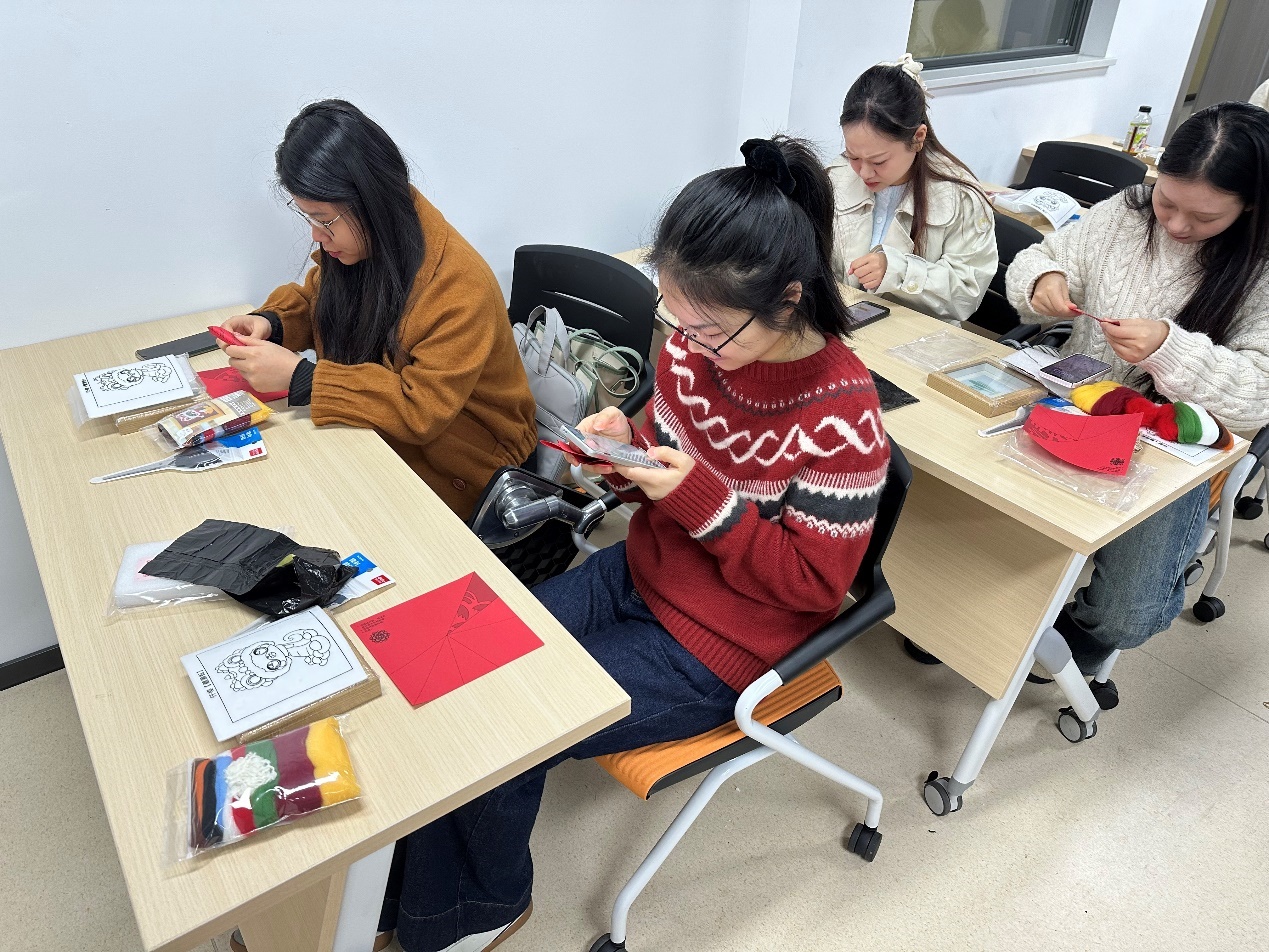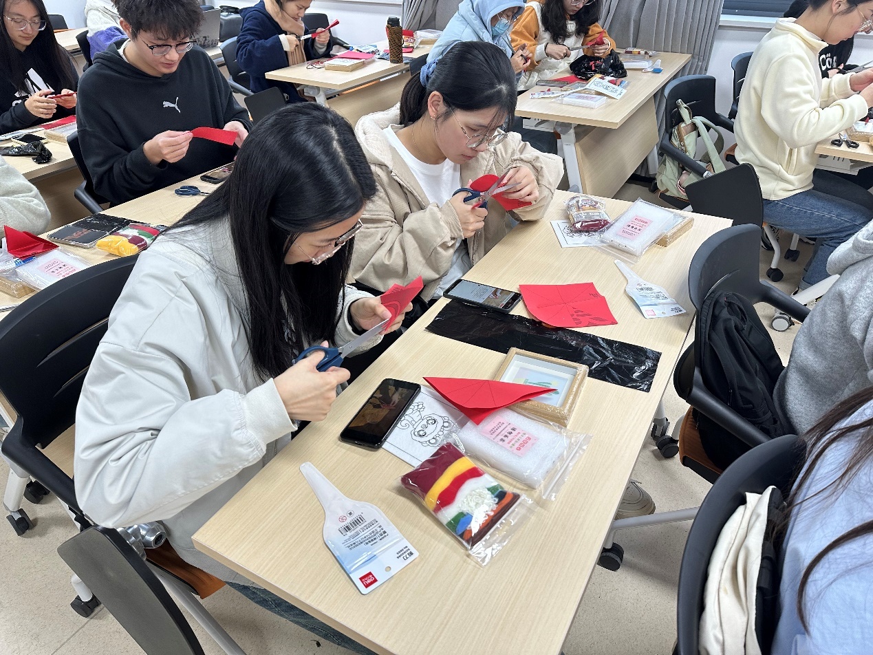 活动当天,pp电子官方网站入口楼102教室热闹非凡。同学们围坐在桌前,桌上摆满了剪刀、红纸、羊毛毡针具和五彩羊毛等手工材料。在剪纸体验中,同学们发挥创造力,用灵巧的双手剪出了窗花、花鸟、吉祥图案等富有传统特色的作品,红纸在剪刀下变成了一幅幅栩栩如生的艺术品。另一边,羊毛毡体验同样趣味十足。同学们用羊毛毡针将五彩羊毛戳成形状各异的卡通形象。制作过程中,同学们很快掌握技巧,完成了自己的独特创作。活动现场欢声笑语不断,每个人都享受着动手创作的乐趣。