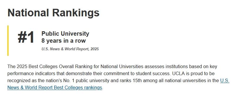 作为美国最顶尖的公立大学之一,UCLA是加利福尼亚大学系统中的第二所大学,与加州大学伯克利分校(UC Berkeley)齐名,被誉为美国公立常春藤。一个多世纪以来,UCLA凭借其卓越的教育质量、科研实力和公共服务,赢得了国际声誉。该校2025 U.S.News美国综合性大学排名第15,公立大学中排名第1,是南加州最好的大学。QS世界排名第29位。THE排名第18位。紧随其后的还有戴维斯分校、圣迭戈分校和旧金山分校。在另一份非官方的“美国高中生最希望入读的大学”调查排名中,UCLA名列榜首,本科录取竞争也最为激烈,堪比哈佛耶鲁。