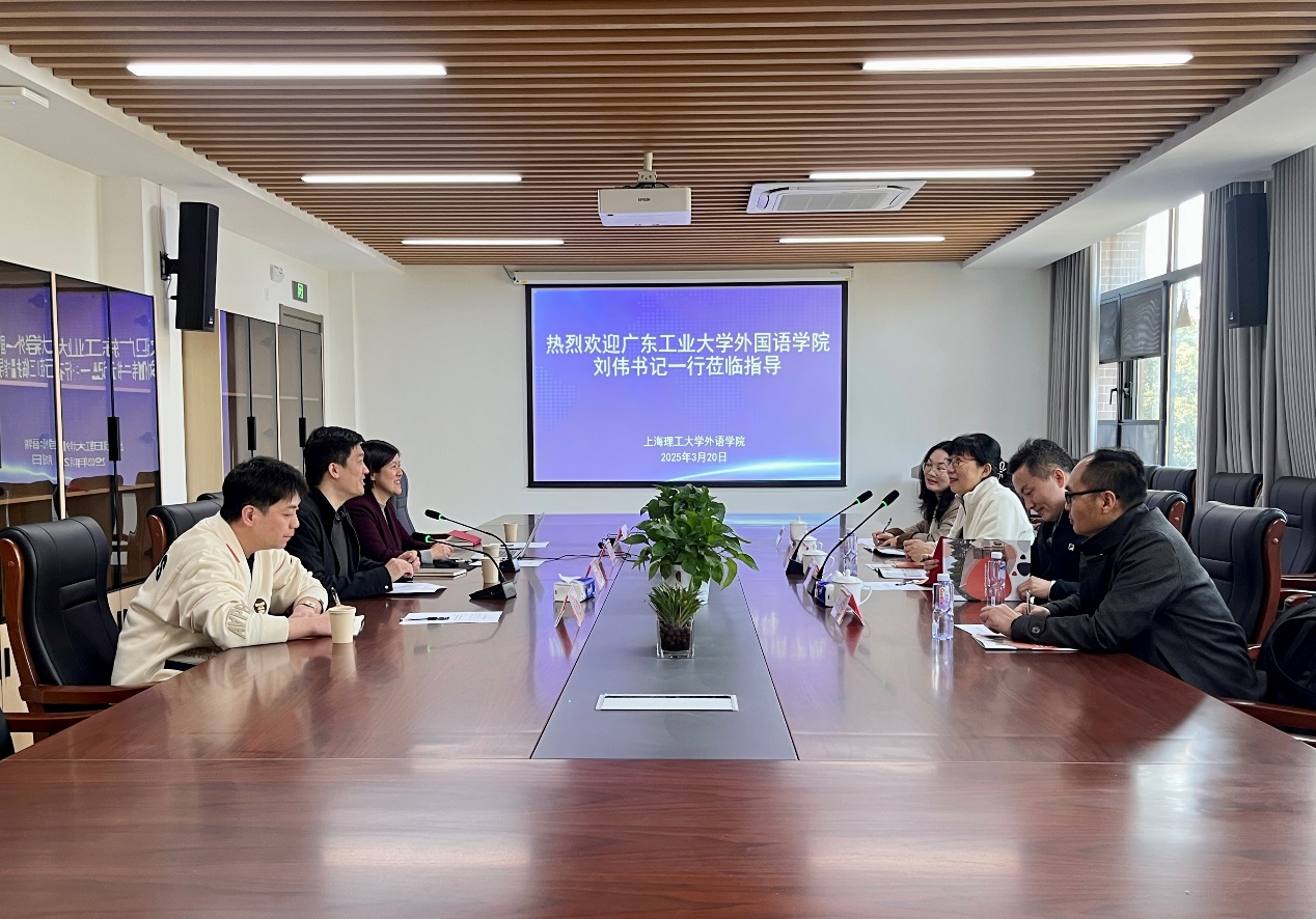 3月20日下午,广东工业大学外国语学院党委书记刘伟、副院长李道全、院长助理任朝旺、党政办主任谭小琴一行四人来pp电子调研。pp电子官方网站入口院长刘芹、副院长张乐和相关办公室人员参加了座谈会。会议由张乐主持。