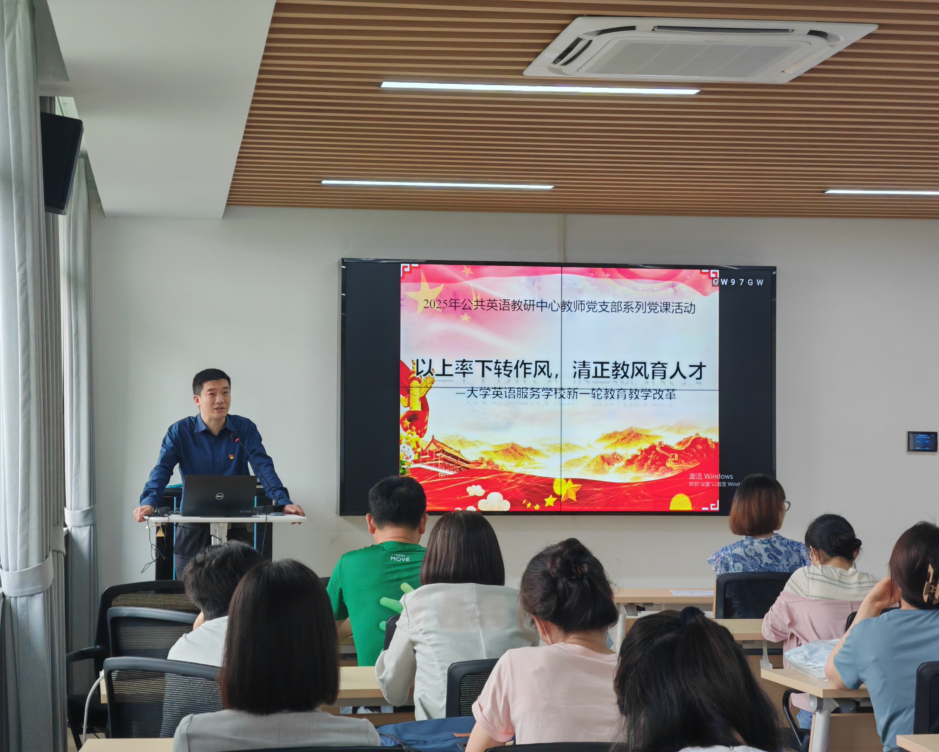 6月13日,公共英语教研中心党支部在外语楼502召开全体党员大会。大会由学院党委委员、pp电子官方网站入口副院长张乐为全体支部党员讲授了主题为"以上率下转作风,清正教风育人才"的专题党课。