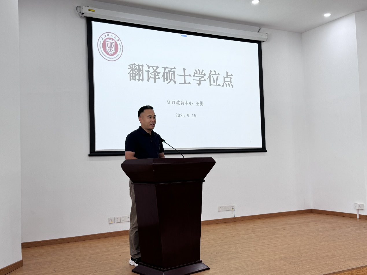 MTI教育中心主任王勇重点介绍翻译硕士专业特色建设,突出学院在科技翻译、国际合作领域的显著优势,展望MTI教育的广阔前景,鼓励学生拓展国际视野、强化实战能力,成长为复合型翻译人才。